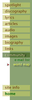 and how many of us will there be? Map of the WorldThese maps started out as a way to show where all the members of the siblings list live (say that three times fast). But it is not limited to members of the siblings e-mail list -- it also includes visitors to this site. To add yourself to the map, send an e-mail that states the location of your primary residence (latitude and longitude, preferably). Use "map of the world" as the subject. The maps Earth |